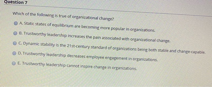 They help generate a collective vision for the organization. Which of the following is true about organizational change. Question 28 Organizational change can take the form of which of the following.